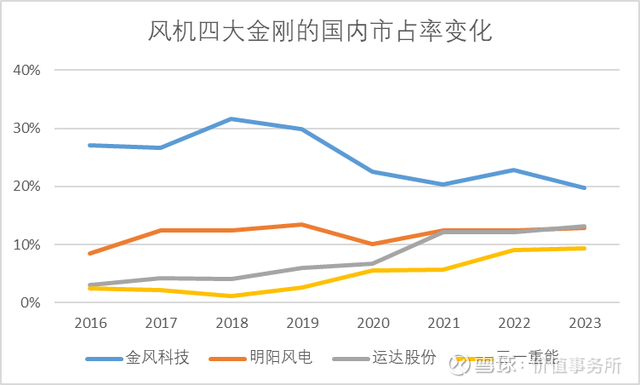 对风电有所了解的同学应当清楚金风科技才是老牌风机龙头,一直保持市场份额第一,但就是在金风这个老牌龙头的眼皮子底下,三一成长起来了,而且势头非常猛。虽然现在金风还是龙头,但市占率已经被后起之秀们抢了不少。