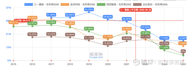 哪怕毛利下滑得这么严重,这几年三一的利润还是非常稳得住,甚至整体呈现增长势态,这几年反而是金风、阳明等非常悲惨。