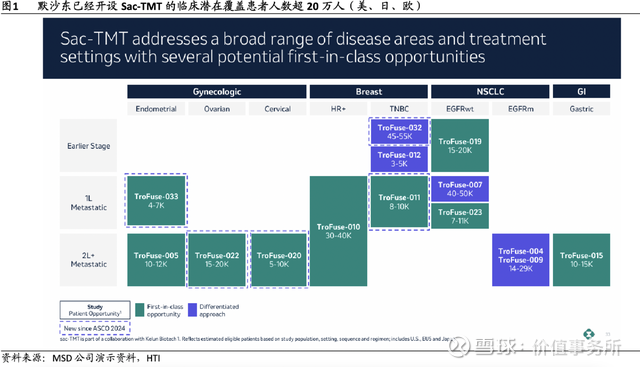 默沙东在海外为Sac-TMT开设14 项注册临床,是默沙东当前临床研究的ADC药物中开设临床数量最多的,可见默沙东的重视程度,这14项临床覆盖肺癌、乳腺癌、子宫内膜癌、胃癌、宫颈癌和卵巢癌,潜在覆盖患者人数 20~30 万人,还出现了首款“PD-1+ADC”的联合疗法。