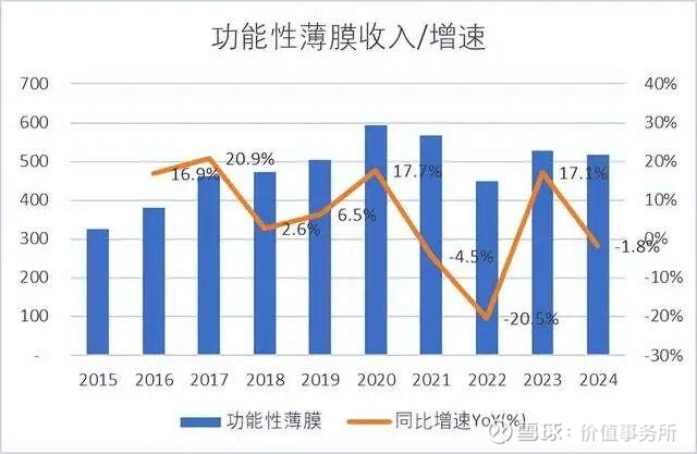 公司功能性薄膜产品2024年收入为5.17亿元,占收比19.2%,同比增速-1.8%,毛利率为18.8%,并没有达到公司预期的产值和利润率目标。