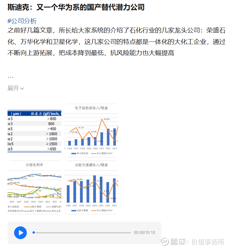 比如POE聚烯烃弹性体,就是一种比传统PE聚乙烯塑料性能更好的改性塑料,产品单价提升了30%。类似的新材料还有很多,正好会客厅有同学问到一家新材料公司斯迪克,斯迪克的核心产品就是PET和丙烯酸下游的粘胶和薄膜产品,也具有一定的发展潜力,我们把它详细分析一下。