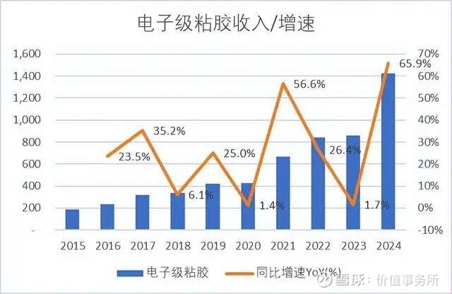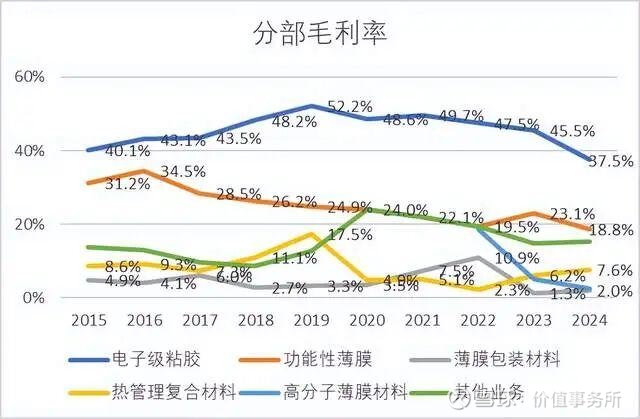 斯迪克并没有披露OCA光学胶的具体收入和销量,而是把OCA光学胶放在电子级胶黏材料的分部之下,2024年分部收入14.25亿,占收比52.9%,同比增速+65.9%。但电子级胶黏产品还包括电子产品中使用的其他粘胶,比如手机内部用来粘结零部件的各类压敏胶,这些产品的价格和毛利率就没那么高,从公司电子级胶黏材料的整体毛利率也能看出来,从2019年的52.2%下降到2024年的37.5%。