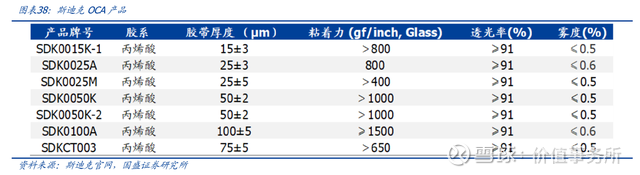 因此光学胶主要就包括了胶材料和膜材料两种主要原材料,其中胶材料是最重要的,决定了光学胶的性能。胶材料主要有丙烯酸压敏胶、聚氨酯压敏胶和其他胶材料等,说到丙烯酸,大家是不是觉得很熟悉?这就是卫星化学C2产品链最重要的中间体产品。斯迪克主要就采用丙烯酸压敏胶作为胶材料,最重要就是透光性要好,至少要达到90%以上。