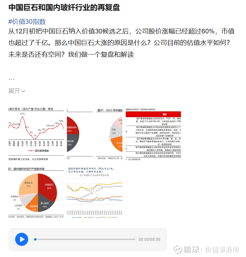 从所长会客厅12月初把中国巨石纳入价值30候选之后,公司股价涨幅已经超过60%,市值也超过了千亿。那么中国巨石大涨的原因是什么?公司目前的估值水平如何?未来是否还有空间?我们做一个复盘和解读。