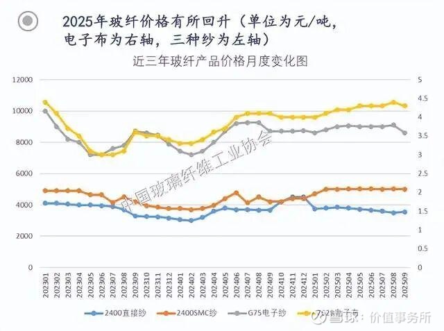 2024年年初玻纤价格触底之后,行业龙头中国巨石首先带头复价,拉动整个行业的终端售价有所回升。2024年玻纤总共提价三次,第一次是普涨,后两次主要是风电纱、热塑纱等中高端玻纤品种。整体而言,从24年二季度到25年年底,从均价来看,传统玻纤基本上保持在4,000元/吨不到的均衡水平上。