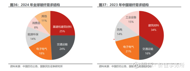 玻璃纤维作为本世纪以来逐步兴起和广泛应用的高科技新材料,具有强度高、重量轻、成本低的优点,被广泛应用于多个下游应用领域。根据中国巨石年报,2024年全球玻纤下游需求中,基建和建筑材料、交通运输、电子电气、能源环保、消费品、其他(海洋产业、航空航天、医疗等),占比分别为 25%、24%、18%、14%、8%、11%。