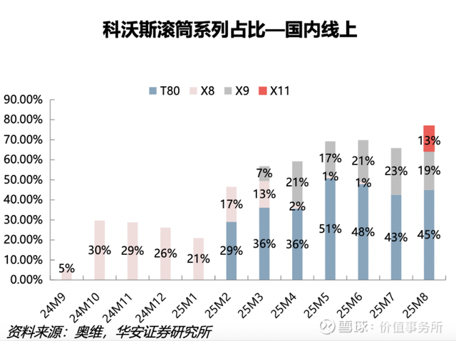 以科沃斯的新品滚筒系列为例,科沃斯的滚筒2024年9月就发布了第一代,到2025年9月石头科技推出第一代时已经迭代到第四代,国内线上同系列占比最高到了近80%,这是一个非常夸张的数字。