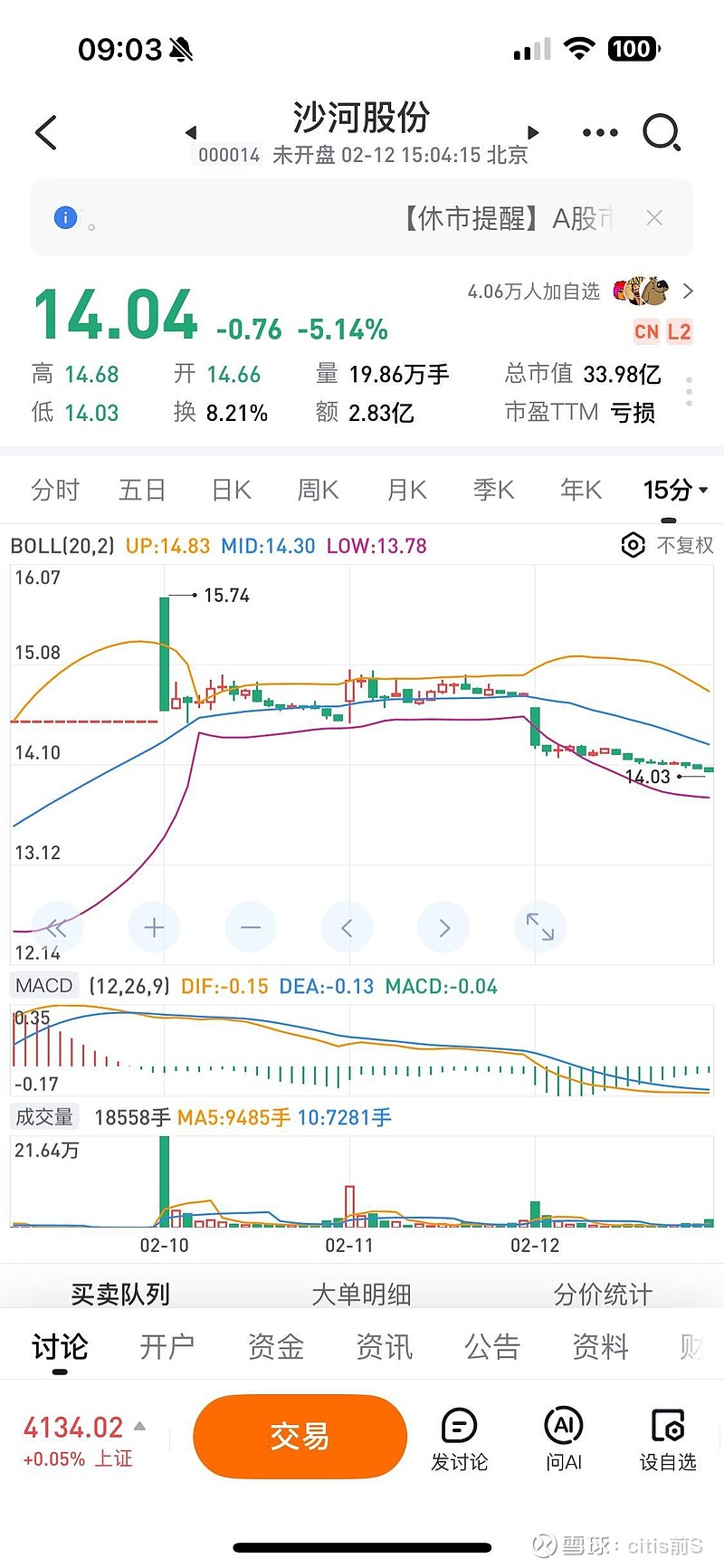 $沙河股份(SZ000014)$ 每天开盘15分钟的交易量是整天成交量的30~50%以上,这不可能是散户的交易状态,这是有同一资金控制的多账户通过量化集中买卖的诱导走势的行为,其实就是赤裸裸的操纵行为,已经和公司的业绩和重组没有关系了,是操纵股价。公司如果视而不见,以后所有的分类投票都有可能通不过,因为这些关联账户可能已经控制了流通盘的70%以上