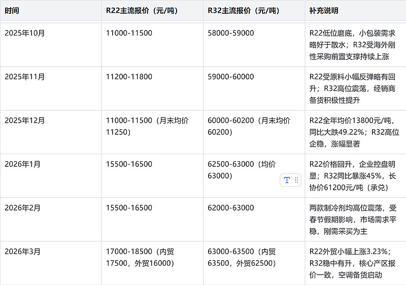 R22制冷剂,2025年从年头18500元/吨下滑至年底11500元/吨,目前2026年3月份报价稳定在17000元/吨