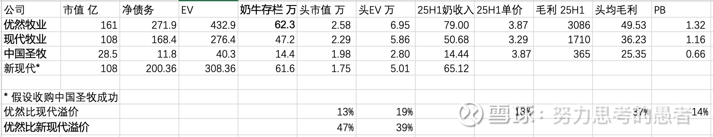 简单做了个表比较了下$中国圣牧(01432)$ $优然牧业(09858)$ $现代牧业(01117)$ 三家的估值情况。优然估值上有溢价,但是因为头均毛利高,所以也很难讲这个溢价不合理。圣牧估值断层式低,但是这个和优然差不多的销售单价,头均毛利能低个接近50%也是很难。