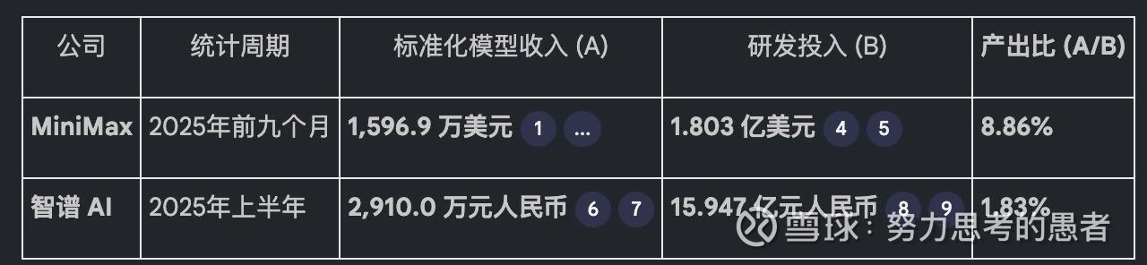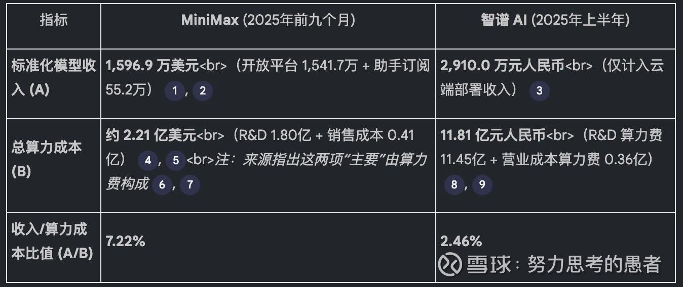 另外一个效率会体现在对GPU卡 / 算力的“压榨”上。通过对比“大模型收入(云端/订阅)”与“总算力成本(训练+推理)”的比值,我们确实可以衡量一家公司在单位算力投入下的商业变现效率。根据两家公司招股书披露的2025年最新财务数据,计算结果如下: