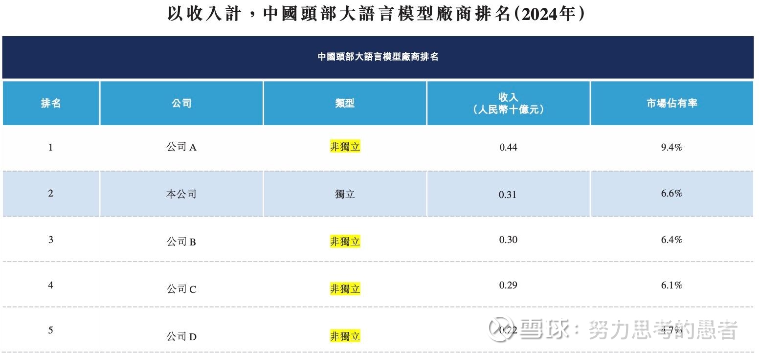 智谱给的排名略有不同,聚焦在国内收入。AI根据上市地点和时间信息推算出A、B、C、D分别是科大讯飞、阿里巴巴、商汤科技、和百度。是不是跟我们盲猜的不太一样?(豆包呢?deepseek呢?腾讯浑元呢?)