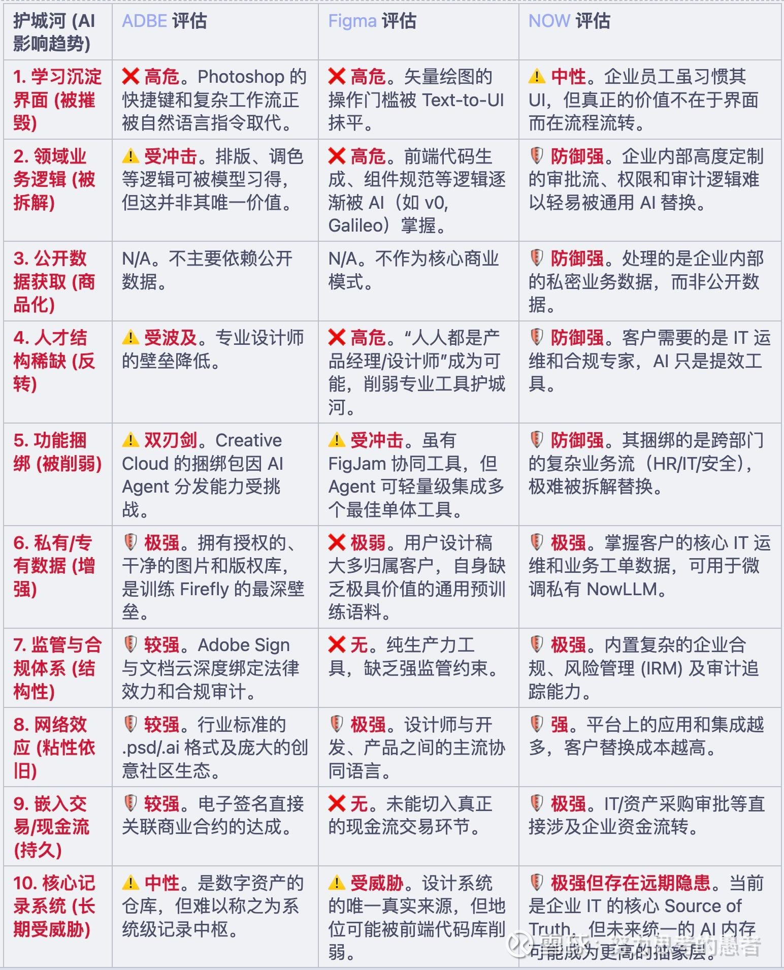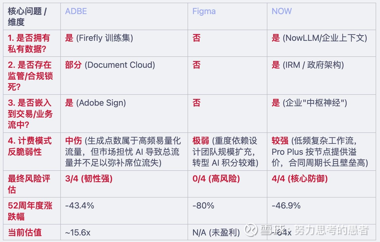 假期学习了一下Nicolas Bustamante 的垂直软件分析框架(有兴趣的强烈建议阅读全文),然后我自己加了一个计费模式脆弱性的纬度进去。试着使用这个框架对ADBE、Figma 和 NOW 三大巨头进行了复盘对比。
