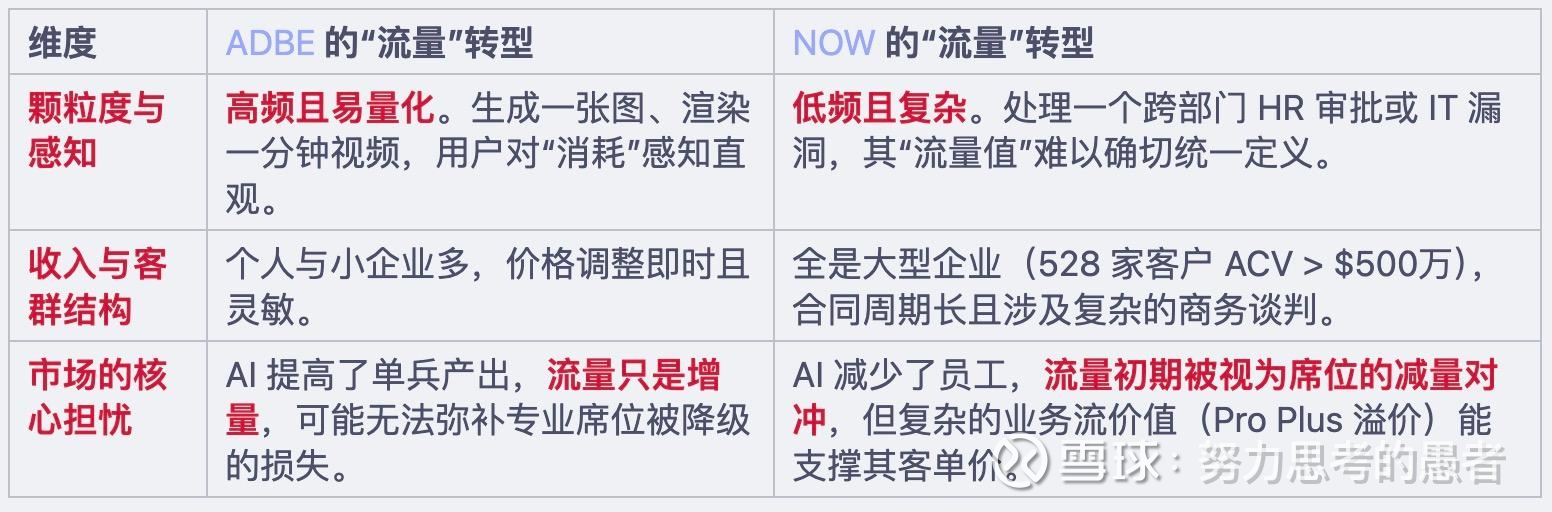 传统 SaaS 极度依赖按席位订阅收费 (Per-Seat Pricing),这在 AI 时代成为了巨大的结构性脆弱点。企业必须从"卖席位"加速转向"卖产出/按消耗收费 (Consumption-based)"。然而,各家向“流量/消耗”转型的难度和市场认知截然不同:
