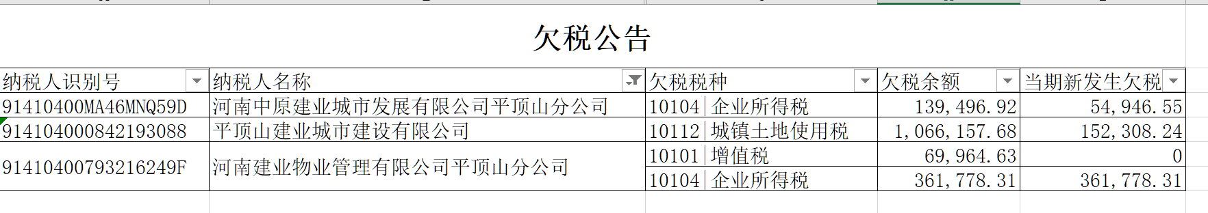 (补充,这个欠税公告应该是24年公告的,23年或者24年初的欠税情况,平顶山分公司目前已简易注销。从河南税务局看到的欠税公告中,没有建业相关的欠税人(只更新到24年底,25年不知为何没有欠税公告了))