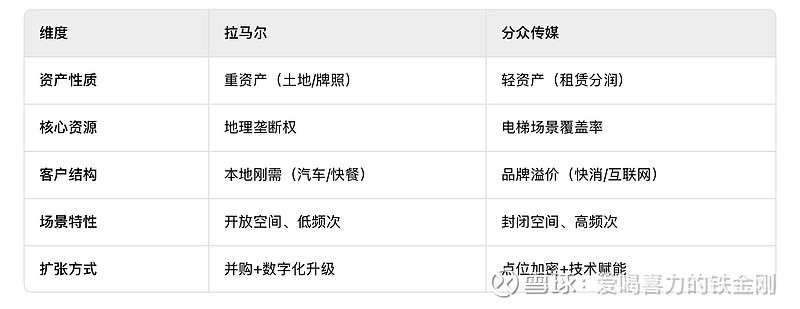 自然我就想对比一下拉马尔与#分众传媒# 。