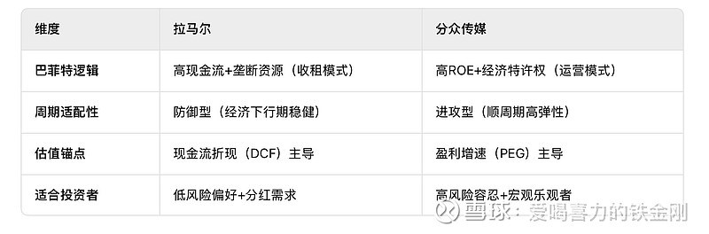 基于巴菲特的投资逻辑,结合拉马尔户外广告(Lamar Advertising, LAMR)与分众传媒(002027.SZ)的商业模式、财务表现及行业特性,以下是深度对比分析:
