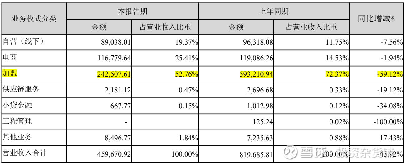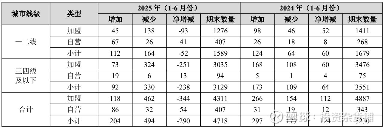 公司采取加盟、自营和电商相结合的销售模式。自营店的经营区域主要为直辖市、部分省会城市等中大型城市的主城区,其他区域主要由加盟商经营,而2024年上半年加盟渠道的收入占公司整体收入的72%,是公司的主要收入来源。