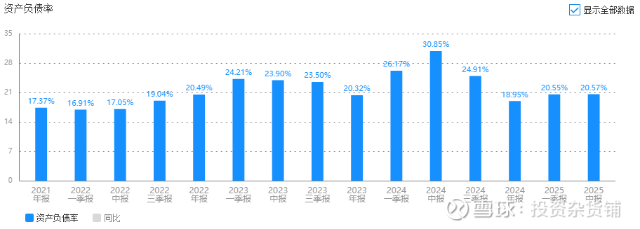 公司资产负债率长期低于21%,2025H1权益乘数为1.26,维持行业最低水平。