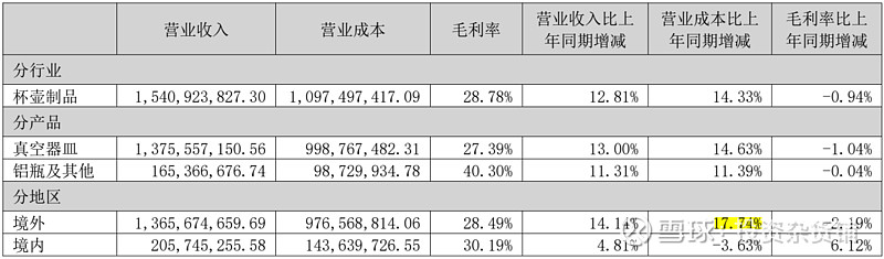 公司作为国内领先的杯壶制造与品牌运营商,专注于不锈钢保温器皿的生产与销售。公司产品线涵盖了多种保温杯、保温壶和焖烧罐。真空器皿也就是不锈钢保温杯,前三季度12.75亿,占总营收的87.54%,处于绝对地位。