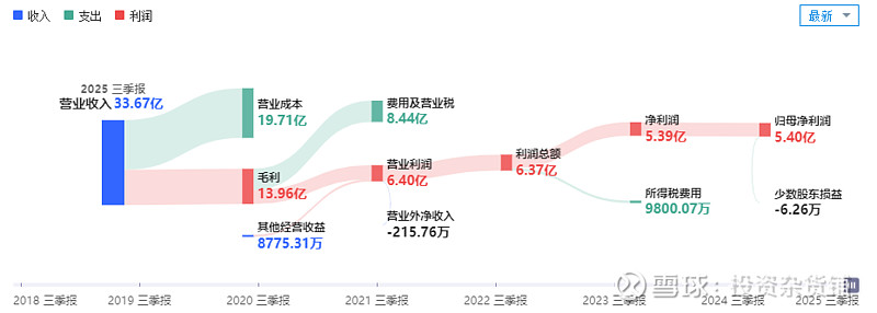 公司发布2025年三季报,前三季度实现营业收入33.67亿元,同比-10.76%,归母净利润5.40亿元,同比-13.52%,扣非归母净利润4.90亿元,同比-19.94%。其中三季度收入12.89亿元,同比-9.83%,归母净利润2.69亿元,同比-5.48%,扣非归母净利润2.22亿元,同比-18.54%。
