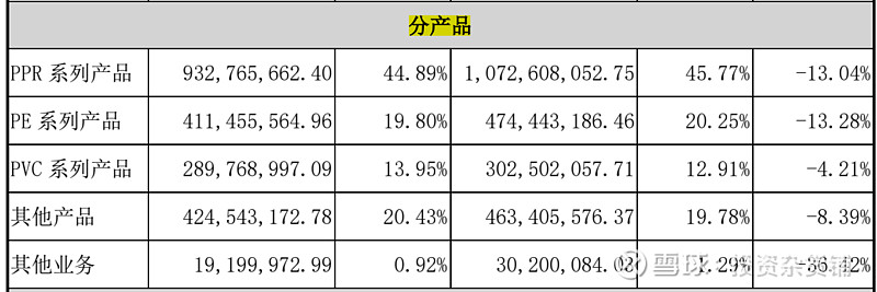 公司主要从事各类中高档新型塑料管道的制造与销售,产品分为三大系列:一是PPR系列产品,主要应用于建筑内冷热给水,占收入的45%;二是PE系列产品,主要应用于市政供水、采暖、燃气、排水排污等领域,占收入的20%;三是PVC系列产品,主要应用于排水排污以及电力护套等领域,占收入的14%。同时,公司积极拓展室内防水、全屋净水等同心圆业务,努力将其培育成新的增长引擎,占收入的20%,还算是做起来了。