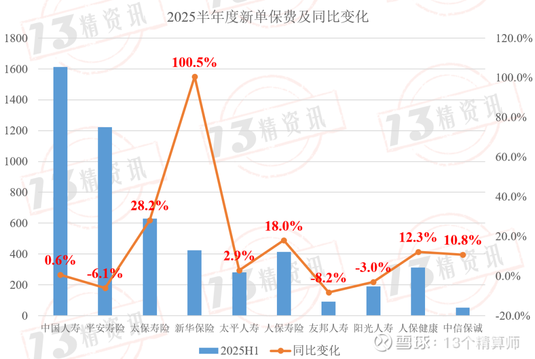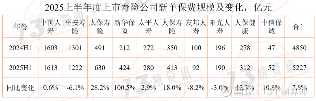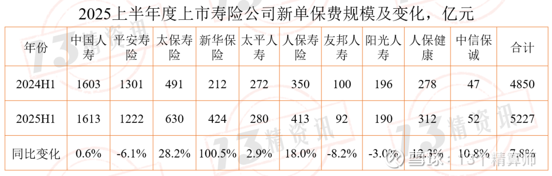 2025上半年度上市寿险公司新单保费合计5227亿元,同比增长了7.8个百分点。太保寿险新单保费630亿元,同比增长28.2%。新华人寿新单保费424亿元,同比增长100.5%。人保寿险新单保费同比增速18.0%。
