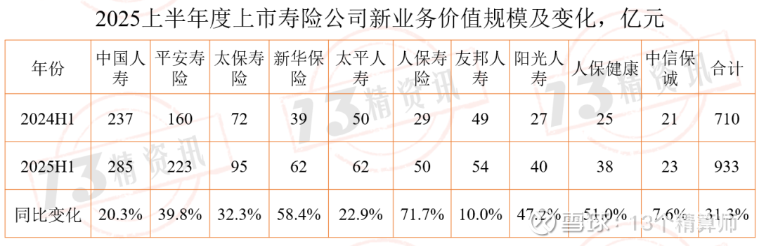 2025上半年度上市寿险公司合计新业务价值933亿元,同比增长31.3%。