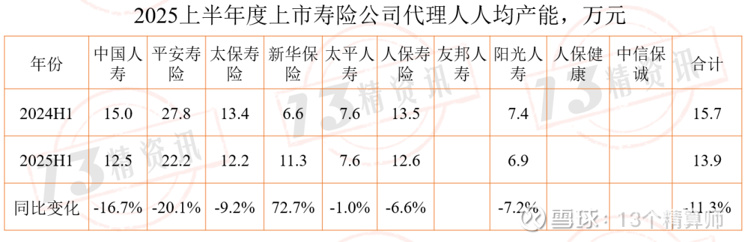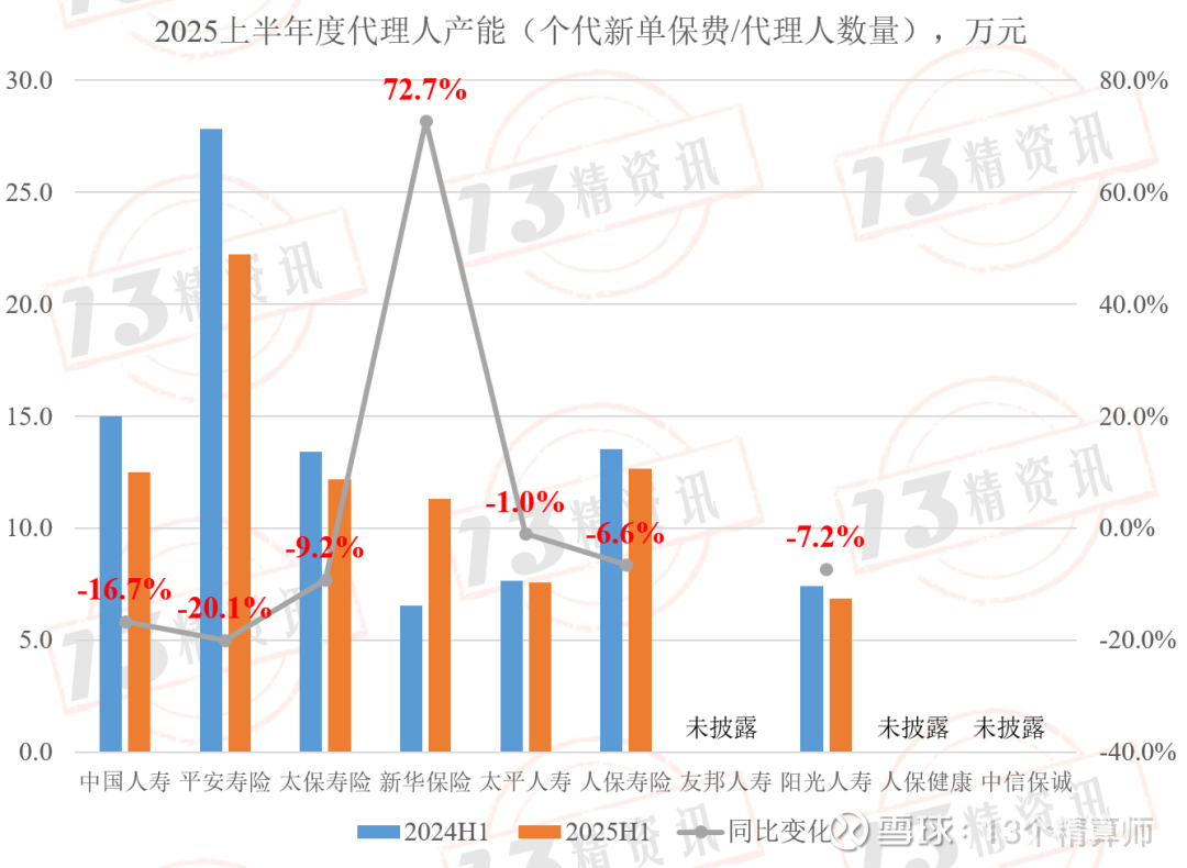 从代理人产能来看,2025上半年的各家公司代理人平均产能13.9万元,同比下滑11.3%。