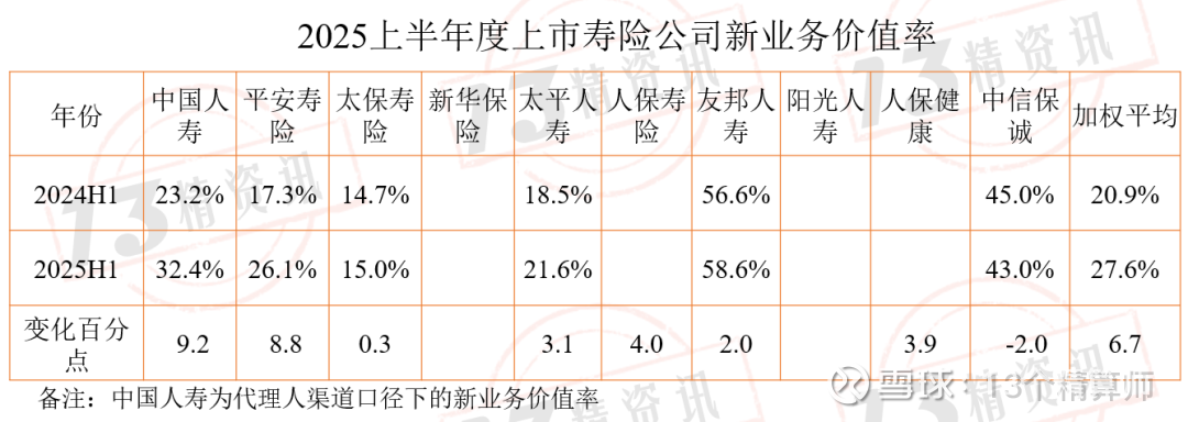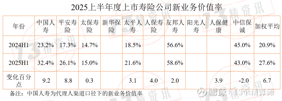 2025上半年,除中信保诚外大多数上市寿险公司新业务价值率大幅度提升。上市寿险行业整体新业务价值率提高6.7个百分点!