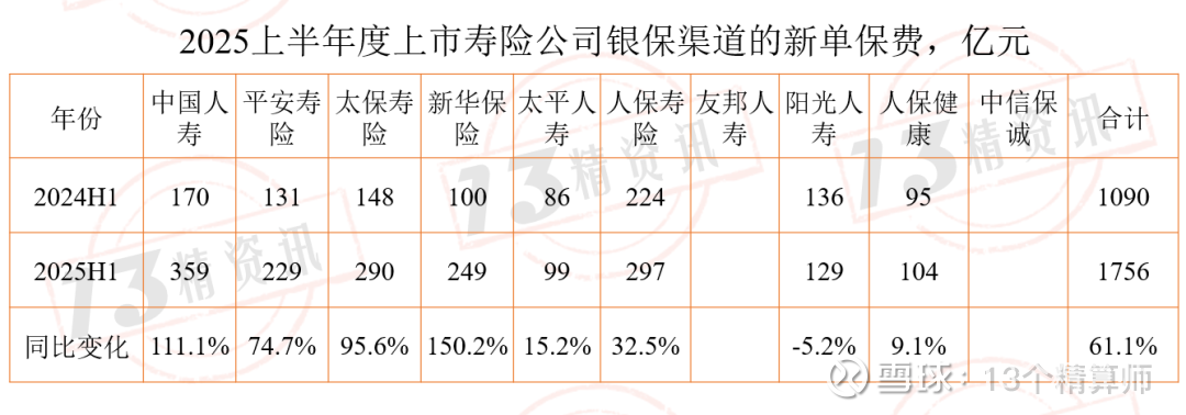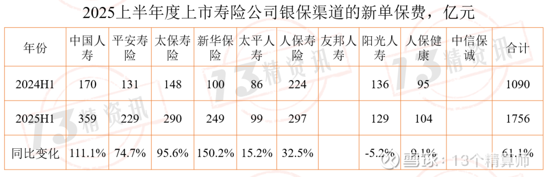 2025上半年度上市寿险公司银保新单保费收入合计1756亿元,同比提高了61.1%。