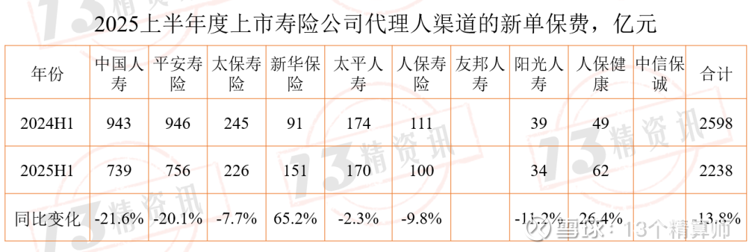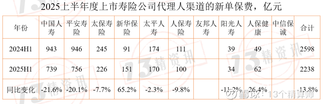 2025上半年度上市寿险公司个代新单保费收入合计2238亿元,同比下降了13.8%。
