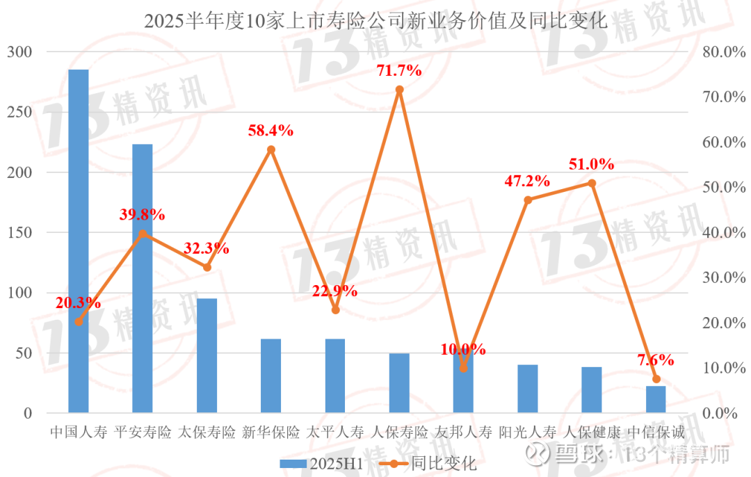 2025年上半年,除中信保诚外,所有上市寿险公司新业务价值均实现了两位数增长!上市寿险行业整体增幅达31.3%。具体如下表所示:
