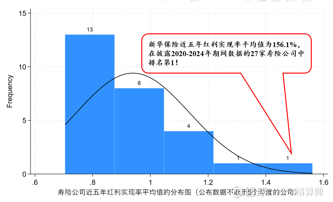 “13精”进一步统计了近五年持续披露分红险红利实现率的27家人身险公司。数据显示,新华保险近五年的红利实现率平均值高达156.1%,在所有披露数据的公司中位列第一。