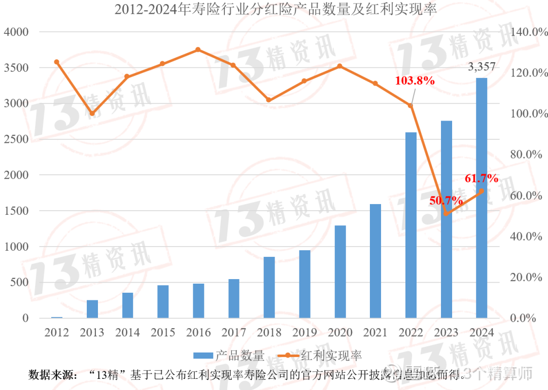 2024年,在统计的3,357款分红型保险产品中,有12款产品的红利实现率为零,完全未能兑现非保证红利;