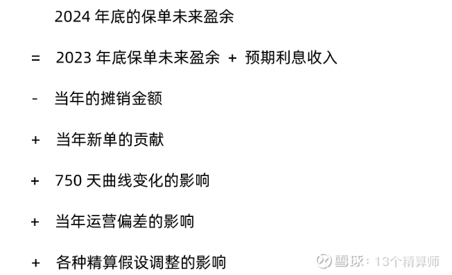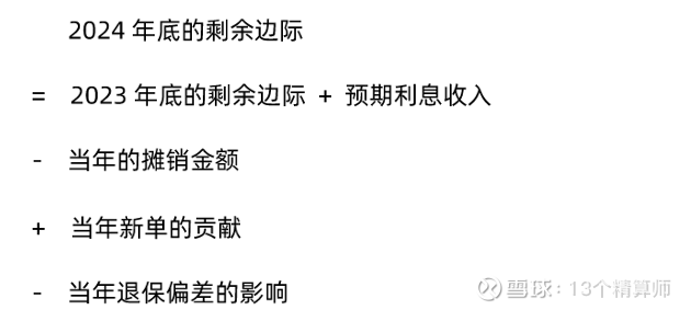2024年已经有多家寿险公司实施了I17,包括上市公司及其旗下的子公司,五家银行系公司,中意人寿和国富人寿。在上市公司中,只有新华人寿没有公布CGAAP下的会计准备金,另外三家已经连续三年税务盈利的公司也没有公布,工银安盛、建信人寿和交银人寿,我们无法计算出ACCIF,自然也就无法用上述公式推导出公司的剩余边际。我们可以尝试用另外一个公式推导出剩余边际(也是在公司最低现价保证为0的前提下),