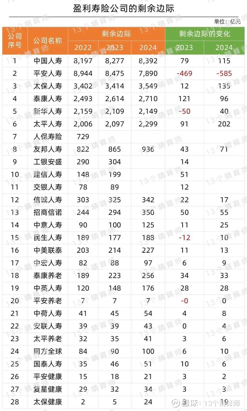 到2024年底,只有27家寿险公司连续三年在税务口径下盈利。附表中有28家公司,其中只有人保寿没有达到这个标准,这从人保寿2022年公布的CGAAP口径下的年报中也可以确认,2021年和2022年都不需要交公司所得税。2022年人保寿及其他上市寿险公司公布了旧准则CGAAP下的剩余边际,2023和2024年在新准则下只公布了合同服务边际CSM。