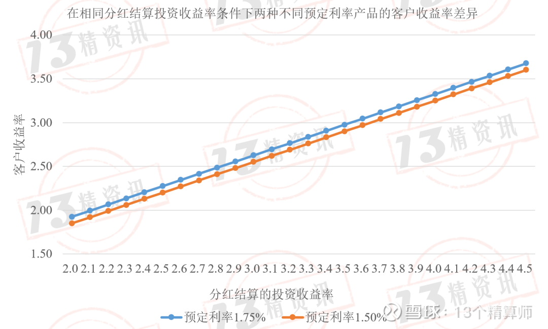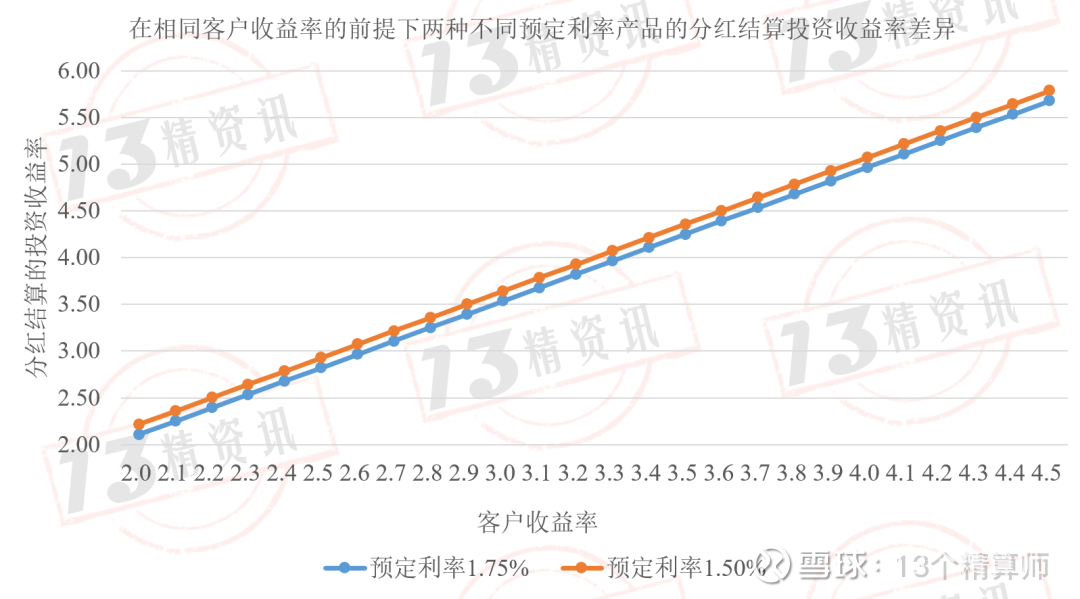 在相同的客户实际收益率前提下,预定利率为1.75%的产品所需的分红结算投资收益率,比预定利率为1.50%的产品低0.11个百分点。