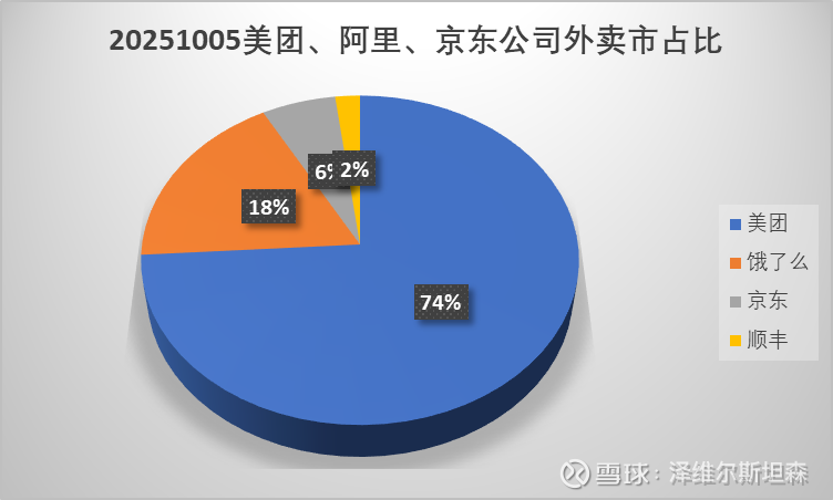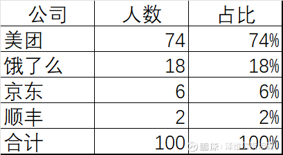 $美团-W(03690)$ $阿里巴巴-W(09988)$ $京东(JD)$ 2025年10月5日晚上7:30,本人为求真知(闲得无聊),在深圳梅林卓悦汇一楼电梯口数人头,一共用时41分钟,数出100名外卖人员,占比如下: