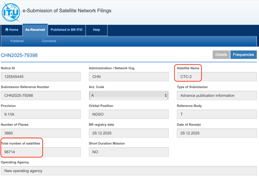 记者查询国际电信联盟(ITU)官网获悉,我国2025年12月向ITU申请了超20万颗卫星的频轨资源。