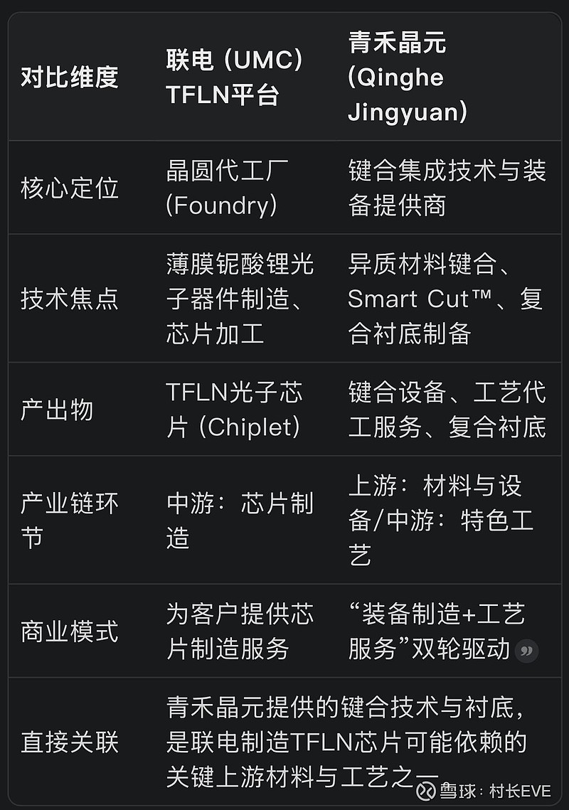 联电负责薄膜铌酸锂(TFLN)光子芯片的晶圆代工制造,而青禾晶元提供将不同材料(如铌酸锂薄膜)与硅等衬底进行异质集成的关键“键合”工艺与设备。以后是复合型衬底,想要什么性能或者考虑到成本高低,比如“铌酸锂薄膜-on-硅”衬底会成为主流。两者是芯片制造流程中前后衔接的环节。