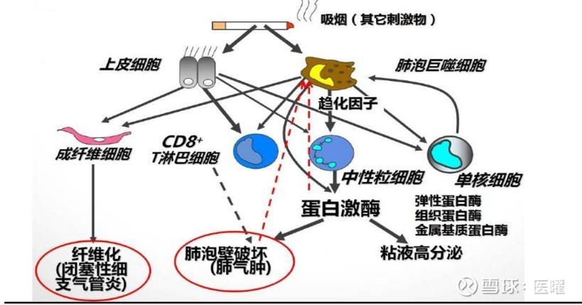 从医学定义看,COPD是以持续气流受限为核心的肺部疾病,包含慢性支气管炎和肺气肿两种表型。其核心病理机制可概括为 “三重打击”:一是慢性炎症导致气道黏液高分泌,阻塞气道;二是蛋白酶失衡破坏肺泡弹性纤维,造成肺泡破坏(肺气肿),气体交换受损;三是反复炎症触发气道壁纤维化和平滑肌增生,导致气道不可逆狭窄。三者叠加,导致患者呼吸困难渐进加重,从活动后气短,发展至静息时亦无法顺畅呼吸。