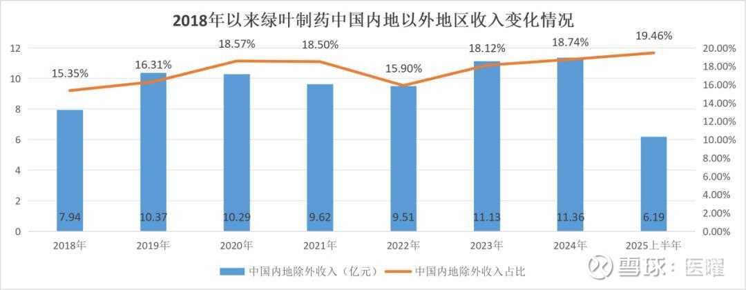 但令人遗憾的是,绿叶制药的海外收入迟迟没有实现大的突破,无论是收入的绝对值还是占比也一直没有太大的变化。