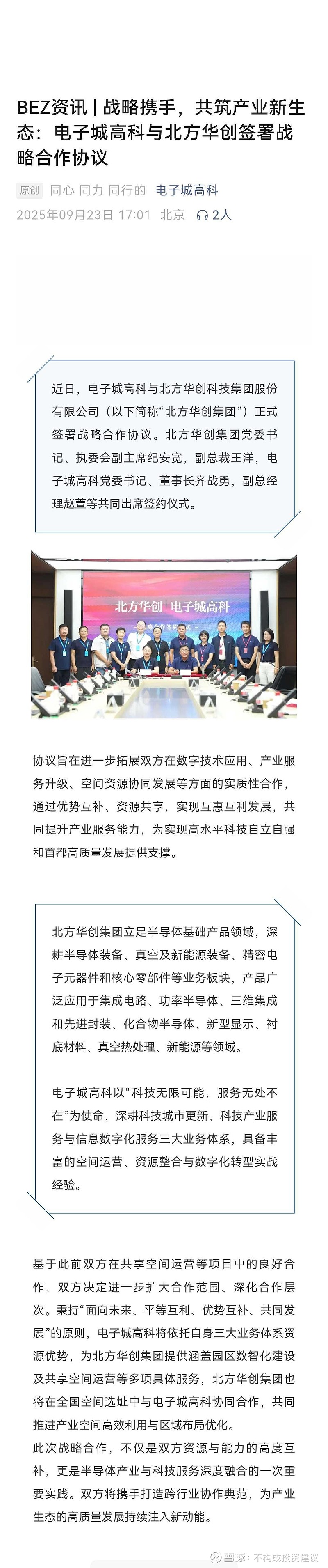 战略携手,共筑产业新生态:电子城高科与北方华创签署战略合作协议