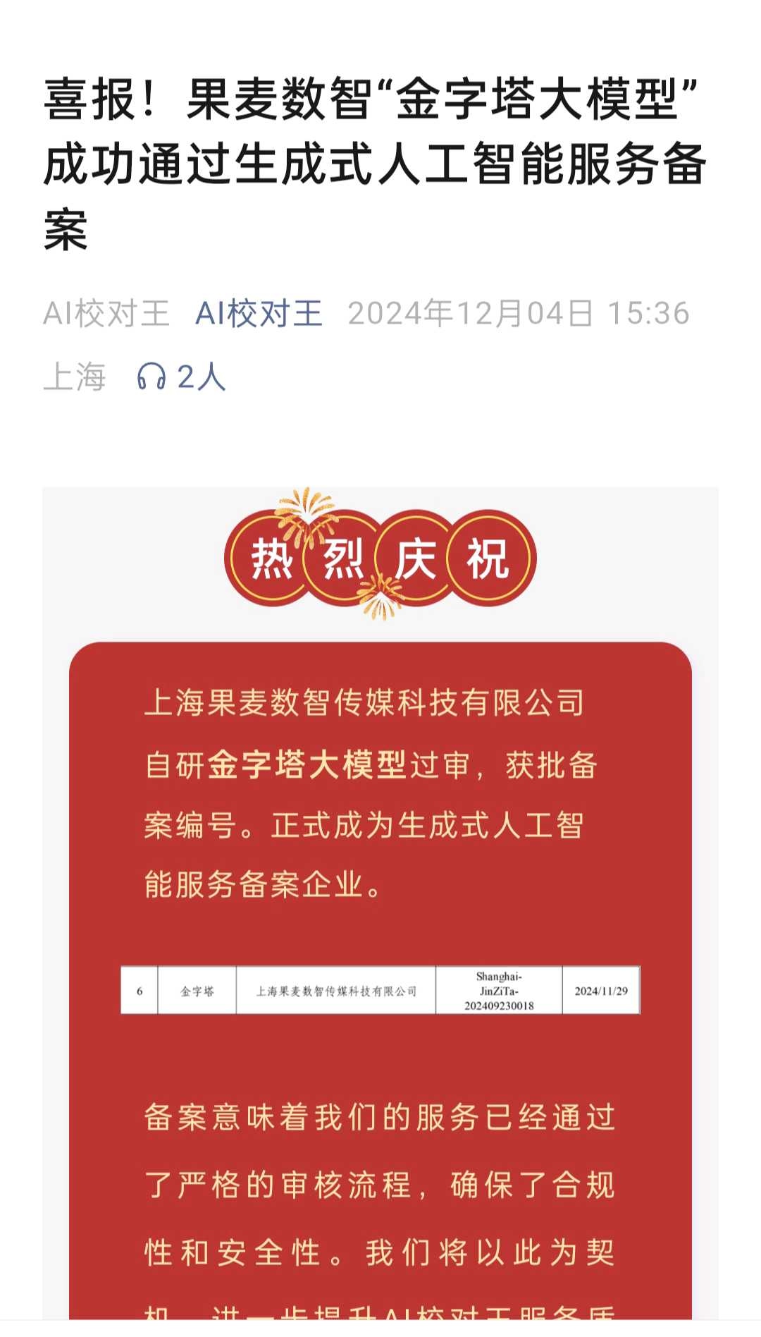 AI校对王官微24年12月披露:果麦文化全资子公司果麦数智自研“金字塔”大模型过审,获批备案编号,正式成为生成式人工智能服务备案企业。备案意味着我们的服务已经通过了严格的审核流程,确保了合规性和安全性。果麦文化24年年报披露:“金字塔”大模型是唯一由出版公司开发且成功备案的大模型。同时公司基于“金字塔”大模型研发的首个产品AI校对王软件于25年上半年正式商业化。
