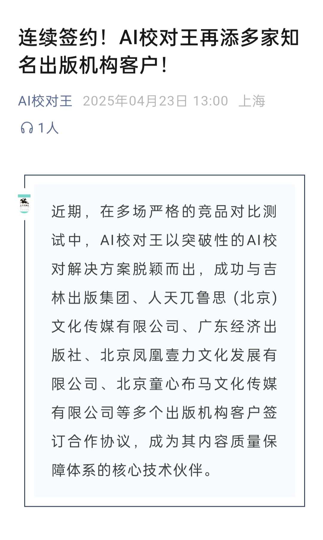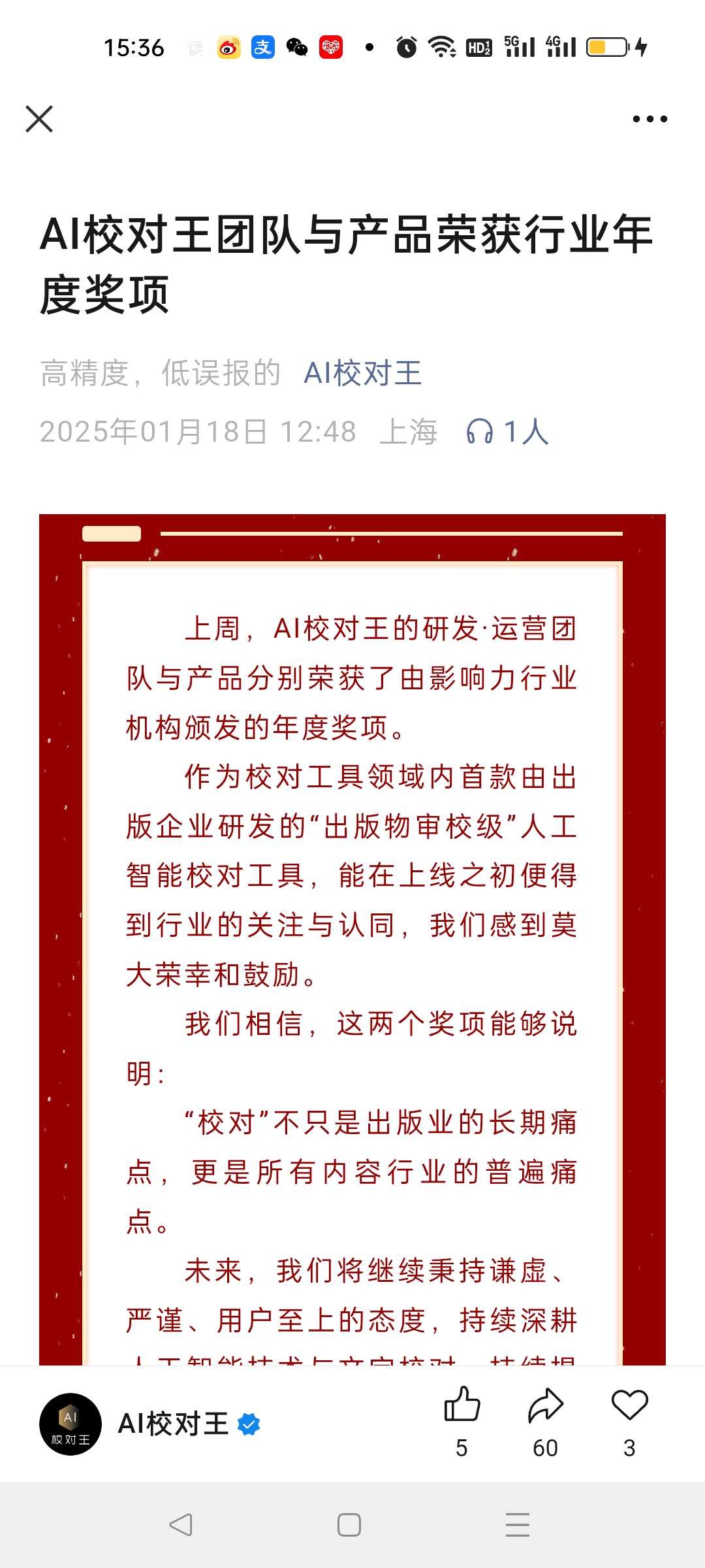 25年1月AI校对王的研发·运营团队获评出版业“年度创新榜样”和AI数字化创新年会的“AI创新应用奖”。作为校对工具领域内首款由出版企业研发的“出版物审校级”人工智能校对工具,能在上线之初便得到行业的关注与认同,说明“校对”不只是出版业的长期痛点,更是所有内容行业的普遍痛点。