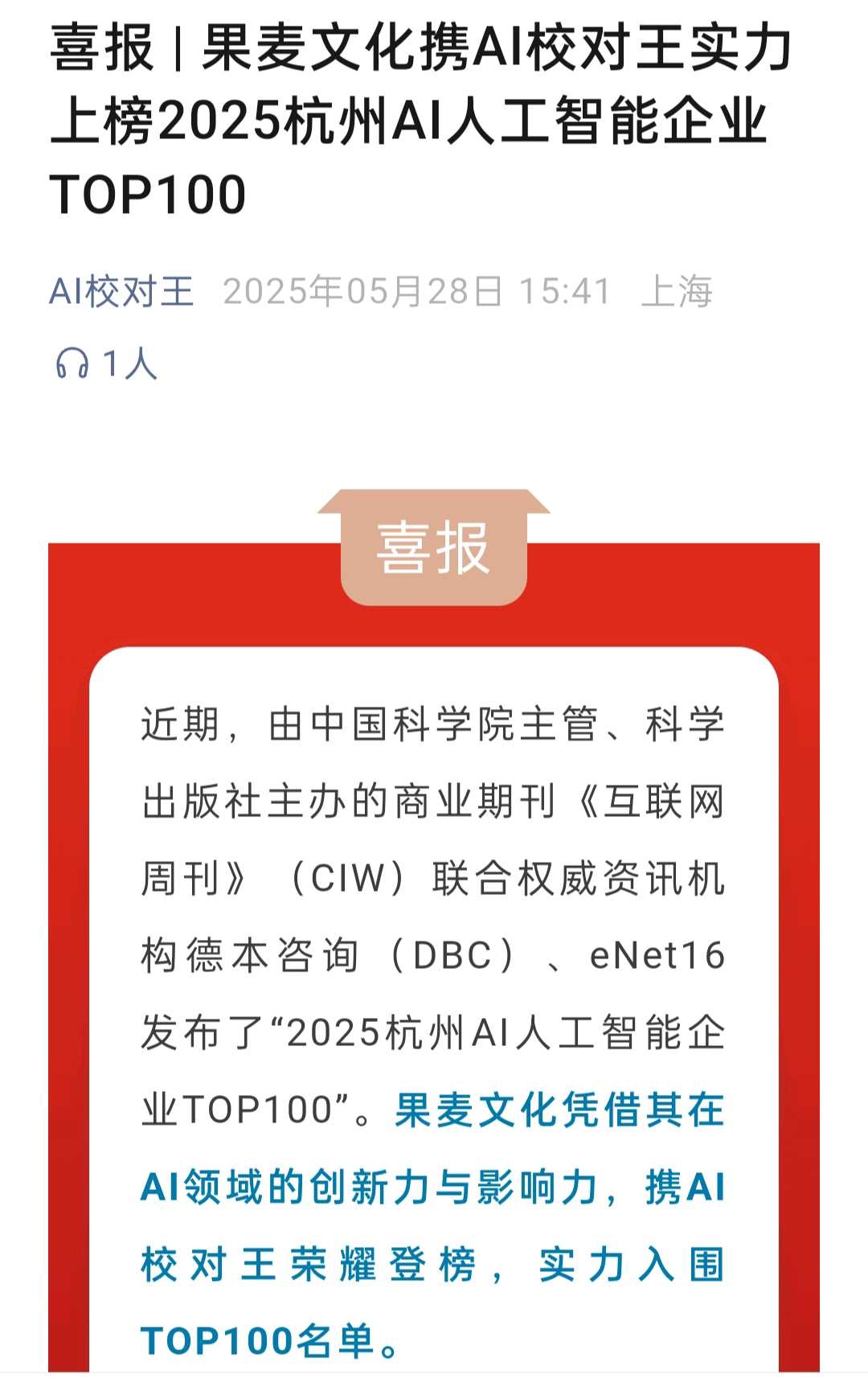 今年5月果麦文化携AI校对王上榜中国科学院等权威部门发布的“2025杭州AI人工智能企业TOP100”