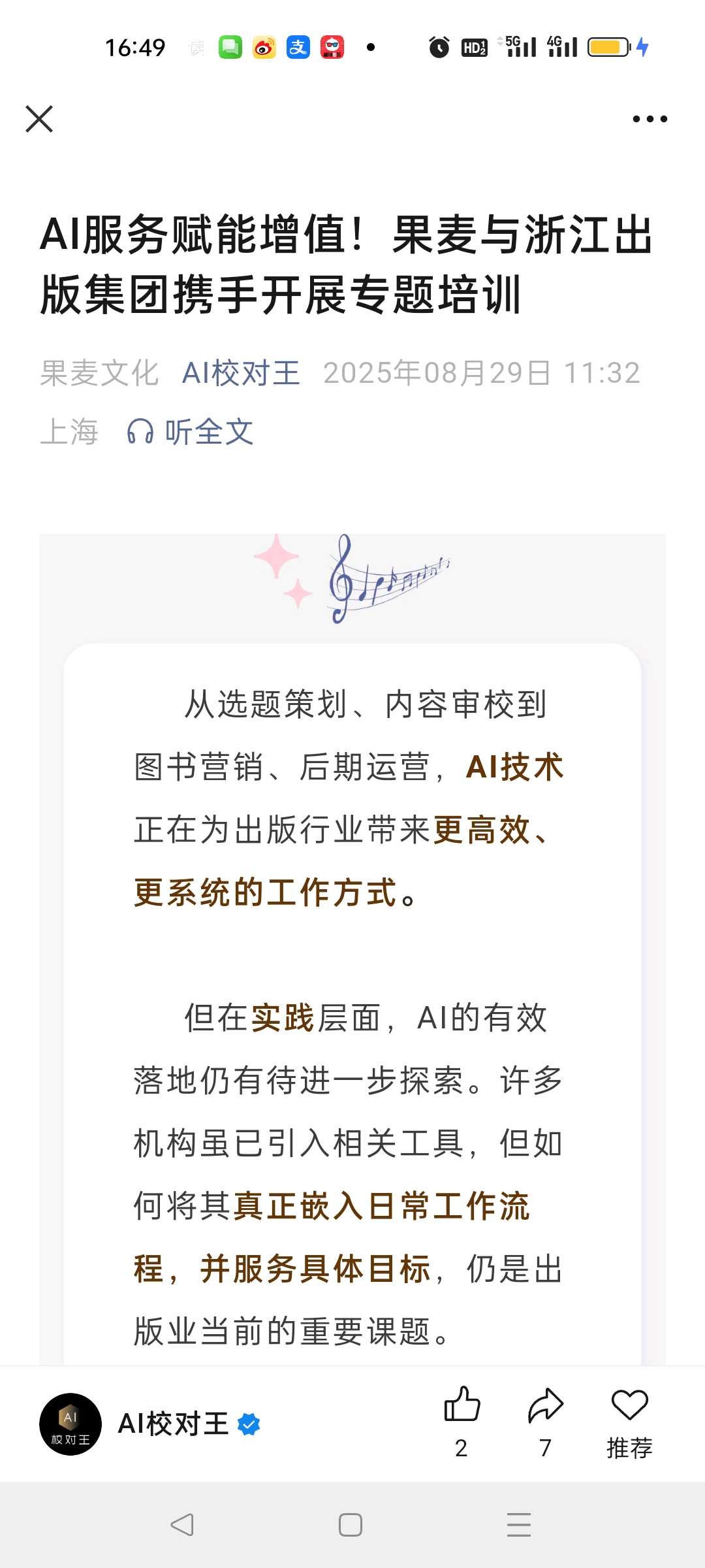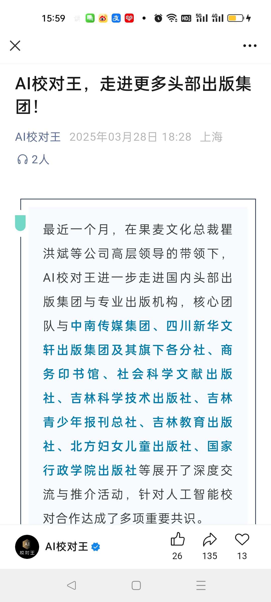 浙商证券今年2月发布深度报告果麦文化:25年两大催化:AI校对王和《三国的星空》链接:网页链接,根据我们预测,我国出版行业文字校对的费用为50亿元,而新闻稿件、论文、年报等文字校对市场总规模预计更高,果麦文化有望陆续将AI校对产品应用至上述提及领域,不断打开成长空间。