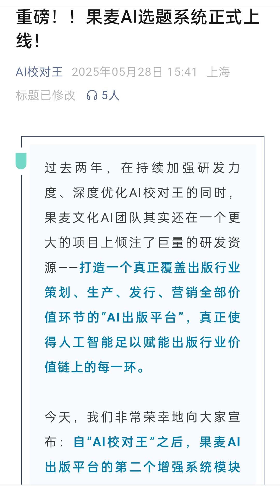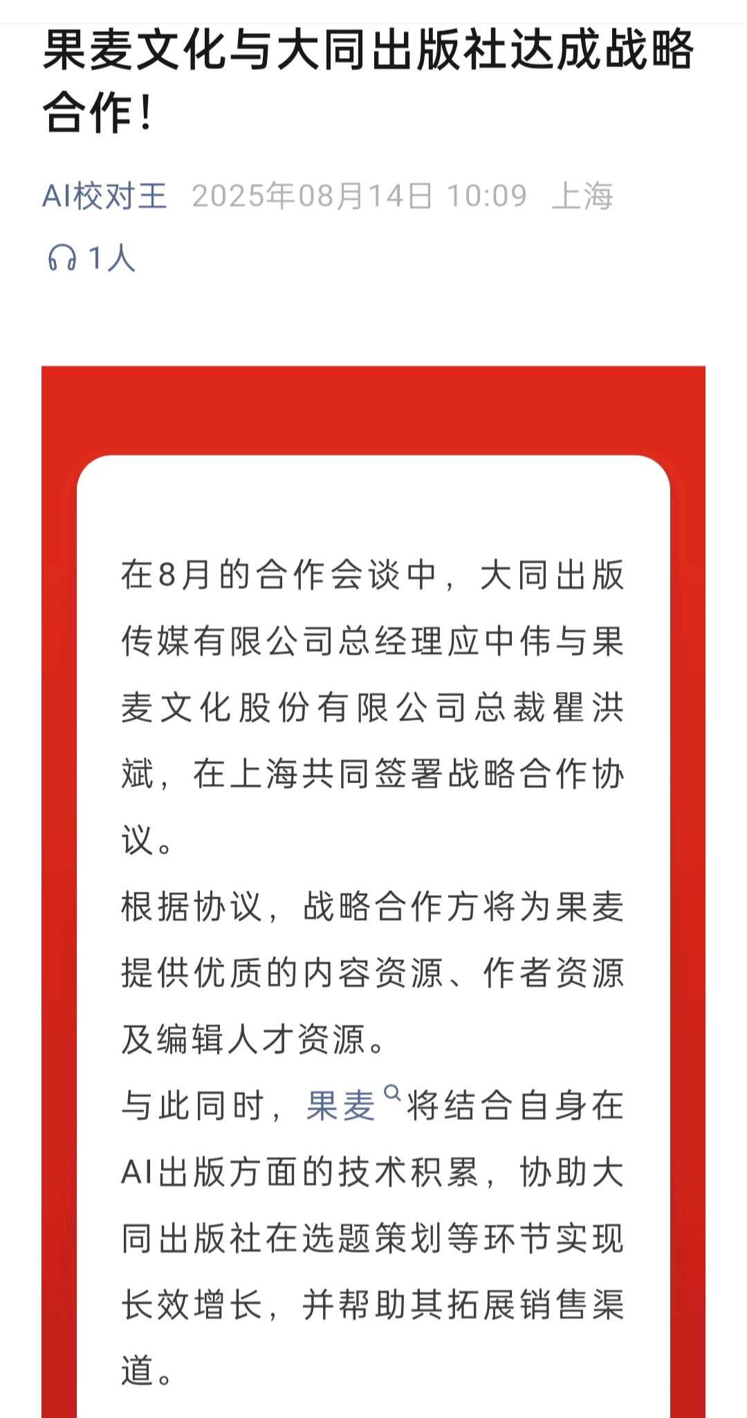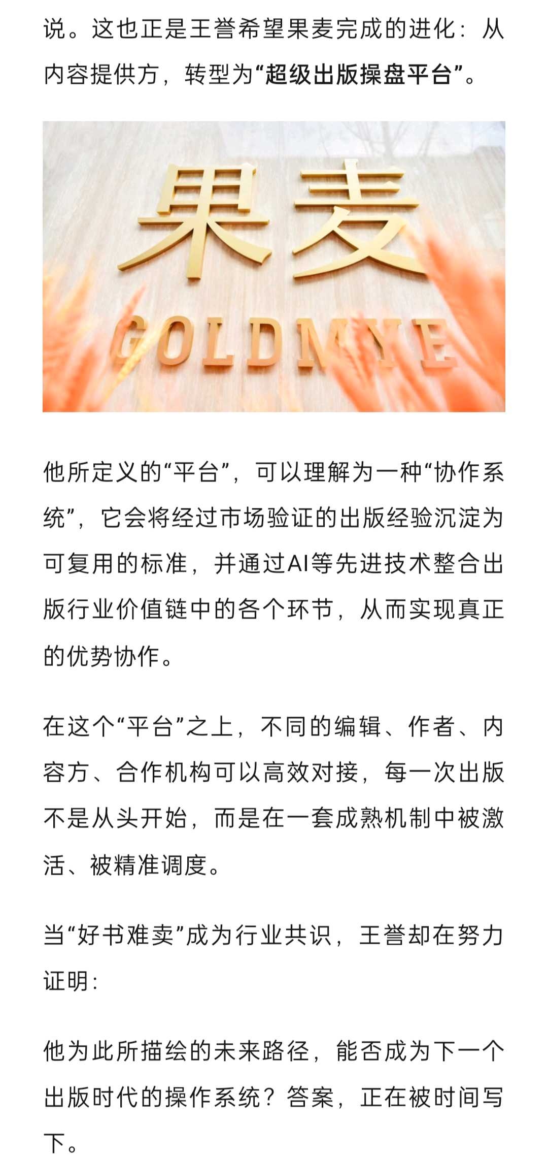 上个月出版行业权威媒体《出版人杂志》发布深度分析文章《4000万册销量,25亿码洋:一个“反常识”的出版操盘手》链接:网页链接,详细分析果麦文化在出版行业数智化方面的独特能力,和果麦从内容提供方,转型为“超级出版操盘平台”的巨大跃迁,果麦AI Agent平台的目标是成为下一个出版时代的操作系统。