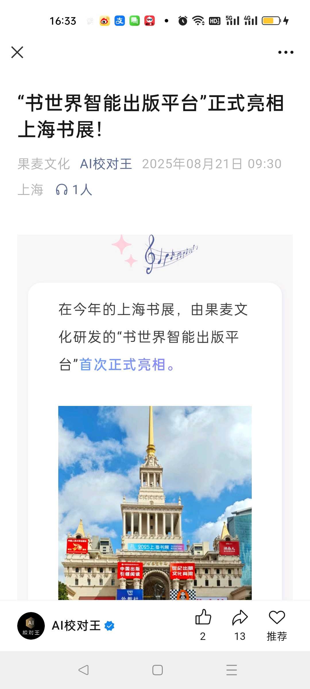 AI校对王官微8月21日官宣“书世界智能出版平台”(AI出版平台智能体Agent)正式亮相上海书展,它是一款真正贴近出版人、真正串联整体出版流程的人工智能系统,功能全面,覆盖了选题策划、内容加工、营销辅助、视频生成等关键环节。当下的出版业正经历着系统性重构:销售路径正从“平台渠道”加速转向“C端流量”,AI等新技术也在重塑内容的生产与传播方式。传统以线性流程、分工协作和人力判断为核心的出版模型正逐步失效,而多数团队尚未建立起与这一新环境相匹配的流程与工具体系,增长的难度与不确定性日益加剧。作为行业内最早全面投入AI出版探索的企业之一,“书世界智能出版平台”,就是我们针对这一困境所提交的最新答案。